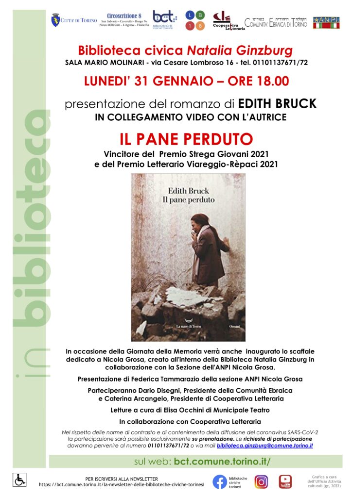 Alla presentazione interverranno da remoto Edith Bruck, in presenza Dario Disegni, Federica Tammarazio per ANPI Nicola Grosa, Caterina Arcangelo Cooperativa di Letteraria e Municipale Teatro.