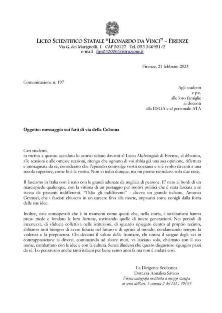 Pubblichiamo la lettera della dirigente scolastica Annalisa Savino del liceo scientifico Leonardo Da Vinci di Firenze ai suoi studenti dopo il pestaggio davanti ai cancelli del Liceo Michelangiolo.