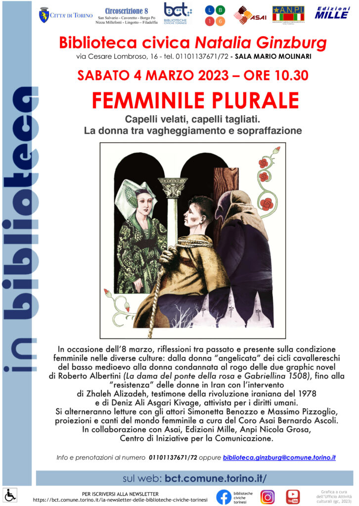 Parteciperemo anche quest’anno alle celebrazioni della Festa della Donna con l’evento di sabato 4 marzo alla Biblioteca Ginzburg, in via Lombroso 16, realizzato in collaborazione con ASAI e Edizioni Mille, con il patrocinio del Comune, della Circoscrizione 8 e delle Biblioteche Civiche Torinesi e con l’ospitalità della Biblioteca Ginzburg e del polo culturale Lombroso 16.
