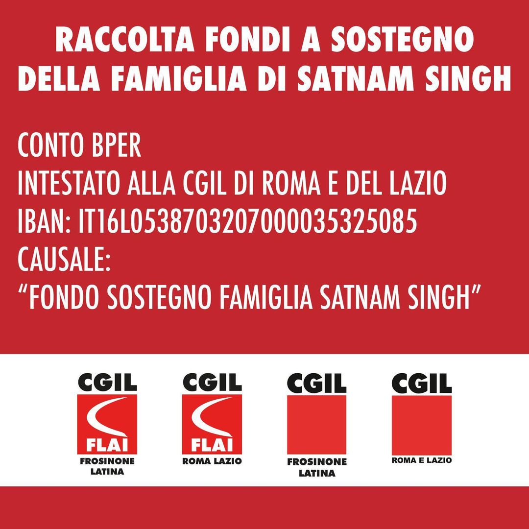 E’ possibile donare attraverso bonifico bancario sul conto BPER intestato alla CGIL di Roma e del Lazio all’iban IT16L0538703207000035325085 con causale “Fondo sostegno famiglia Satnam Singh”. Vedi la locandina.