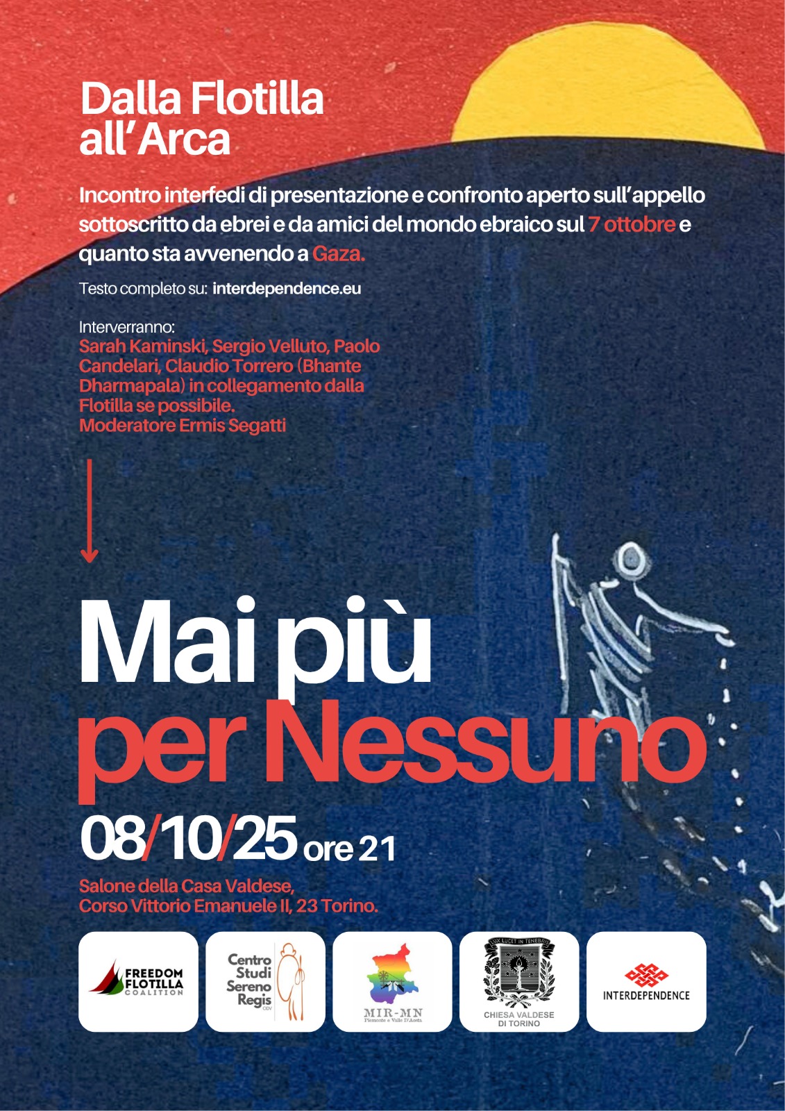 Vi segnaliamo invitandovi a partecipare all’incontro/dibattito interfedi di presentazione e confronto sull’appello sottoscritto da ebrei e da amici del mondo ebraico sul 7 ottobre e su quanto sta avvenendo a Gaza.