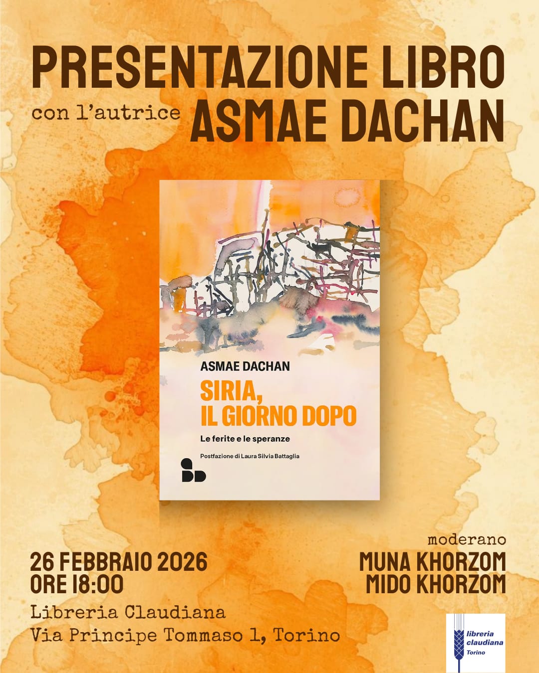 Ci sarà un viaggio in Siria alla libreria Claudiana il 26 febbraio alle 18:00 con la presentazione del libro Asmae Dachan Siria, il giorno dopo – Le ferite e le speranze (add editore ).